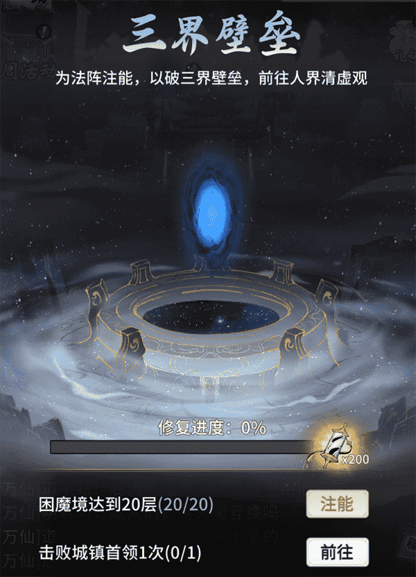 当你修为达到返虚/破虚中期后,,可在城镇寻得芸丫并激活神秘法阵,,,,通过收集材料、、击败首领等方式为法阵注能,,,借以打破三界壁垒,,,开启支线剧情“清虚旧梦”