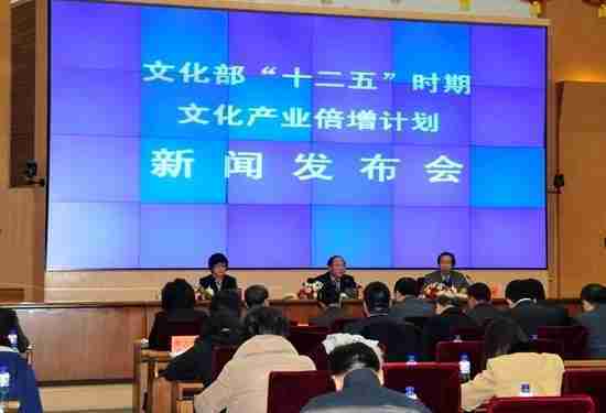 2月28日下午,,,,文化部在京召开新闻发布会,,,正式向社会发布《文化部“十二五”时期文化产业倍增计划》,,,,提出了 “十二五”期间文化部门管理的文化产业增加值年平均现价增长速度高于20%,,,2015年比2010年至少翻一番,,,,实现倍增的奋斗目标。。